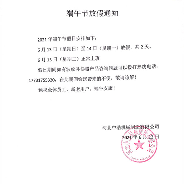 波紋伸縮節廠家端午節假放假通知-中浩機械